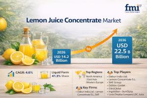 According to a comprehensive strategic outlook released by Future Market Insights (FMI), the global Lemon Juice Concentrate Market is projected to grow from USD 14.2 Billion in 2026 to USD 22.5 Billion by 2036, reflecting a CAGR of 4.6%. Market expansion is supported by rising consumption of ready-to-drink beverages, health-oriented drinks, and processed foods requiring stable citrus flavor profiles.